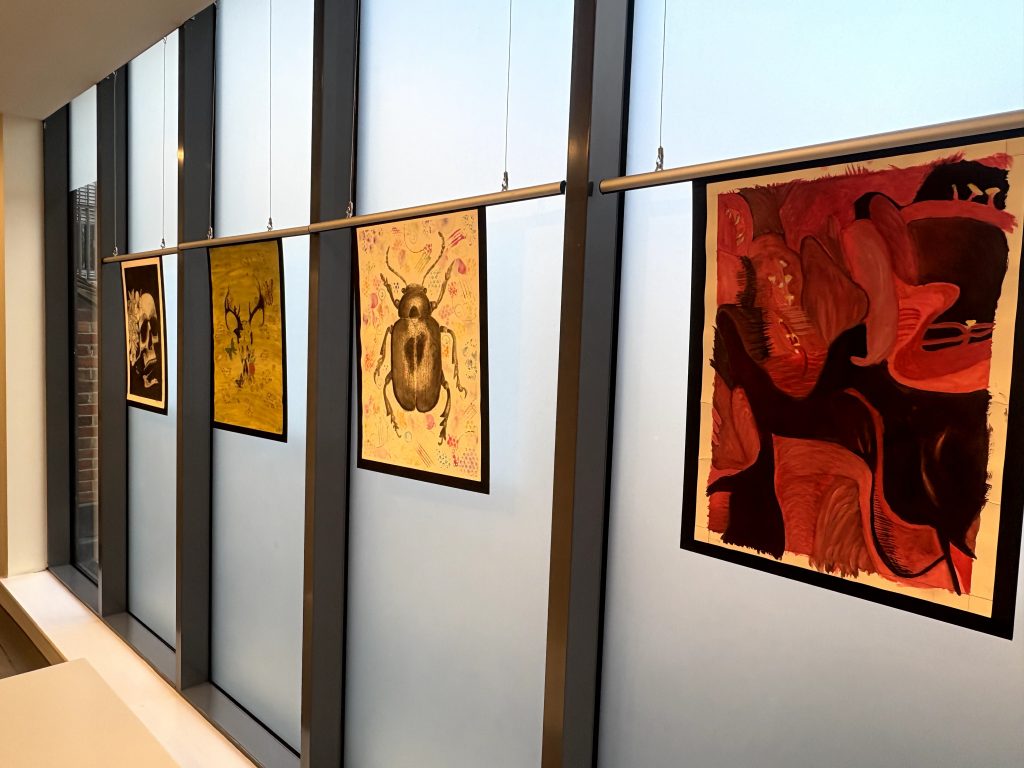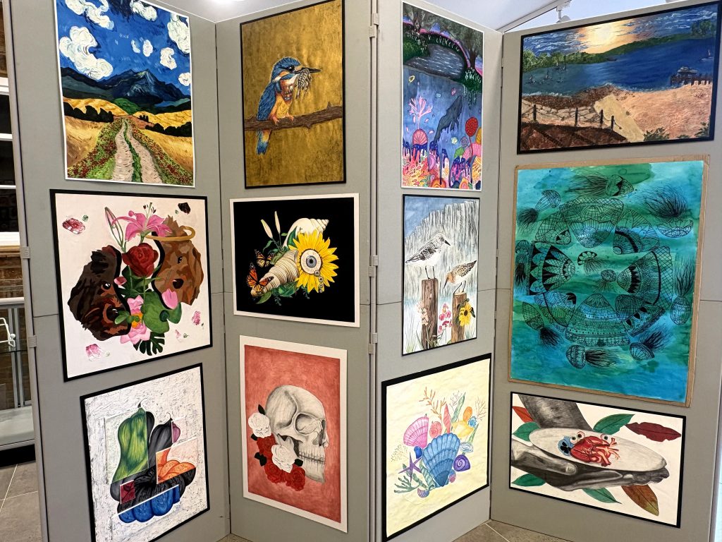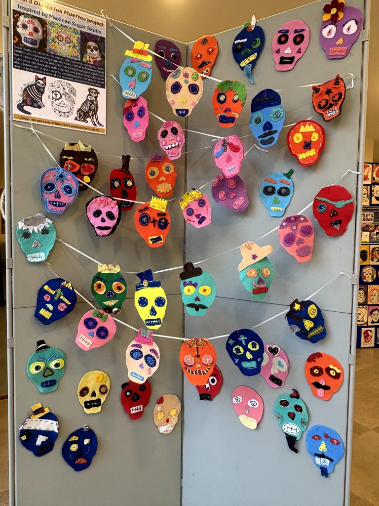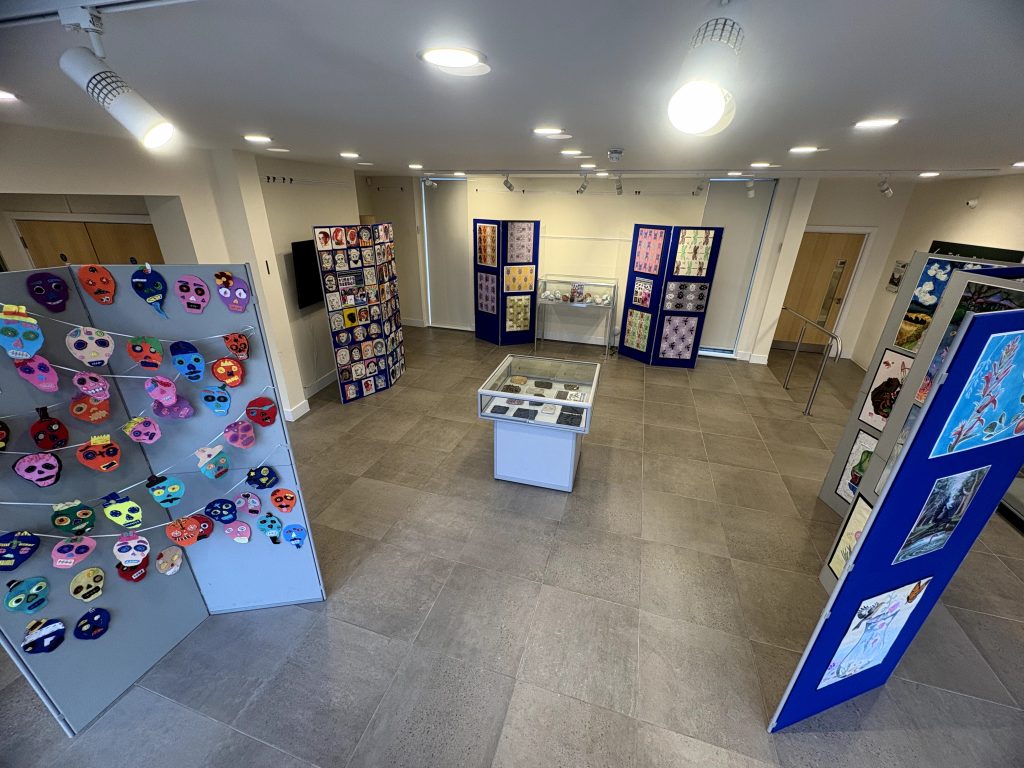 Also on show is a selection of Year 8 work Inspired by Mexican Sugar Skulls. Sugar skulls, or calaveras de azúcar, are colourful, decorated sugar confections representing departed souls, central to Mexico’s Día de los Muertos (Day of the Dead) for honouring loved ones. Made from sugar paste and decorated with icing, foil, and glitter, they’re placed on altars (ofrendas)* or given as gifts, symbolizing life’s temporary nature and the joyful remembrance of the deceased, not something morbid.